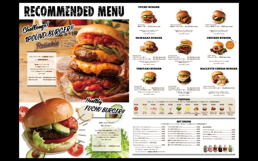 既存の府中バーガーに、ロコモコバーガー、ハワイアンバーガー、てりやきバーガー、ラクレットバーガー、1ポンド府中チーズバーガーをメニューに加えました。