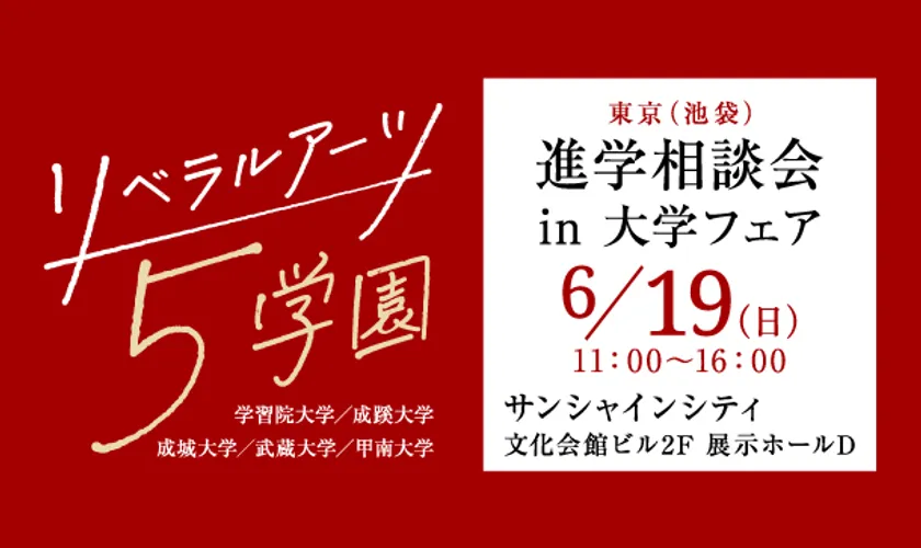 学習院大学・成蹊大学・成城大学・武蔵大学・甲南大学の5大学で構成される「リベラルアーツ5学園」は、旧制高等学校をルーツに持ち、現在も総合的な人間力を養うリベラルアーツを実践しているのが特長です。この5学園が、今年で35年目を迎える大学進学相談会「大学フェア」にて、「リベラルアーツ5学園 進学相談会 in 大学フェア2022」を開催します。