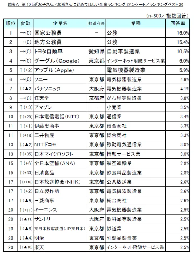 「お子さん/お孫さんに勤めてほしい企業ランキング」(以下、本ランキング)のランキング1位は「国家公務員」(回答率16.0%)、次いで2位「地方公務員」(同15.4%)、3位「トヨタ自動車」(同10.5%)、4位「グーグル(Google)」(同6.0%)、5位「アップル(Apple)」(同5.9%)、6位「ソニー」(同4.9%)、7位「パナソニック」(同4.1%)、8位「任天堂」(同3.8%)、9位「アマゾン(Amazon)」(同3.5%)、10位「日本電信電話(NTT)」(同3.4%)と続きました。(図表A)