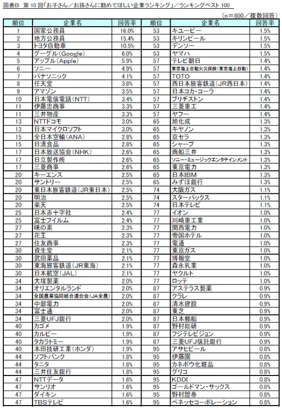 図B_第10回「お子さん/お孫さんに勤めてほしい企業ランキング」/ランキングベスト100
