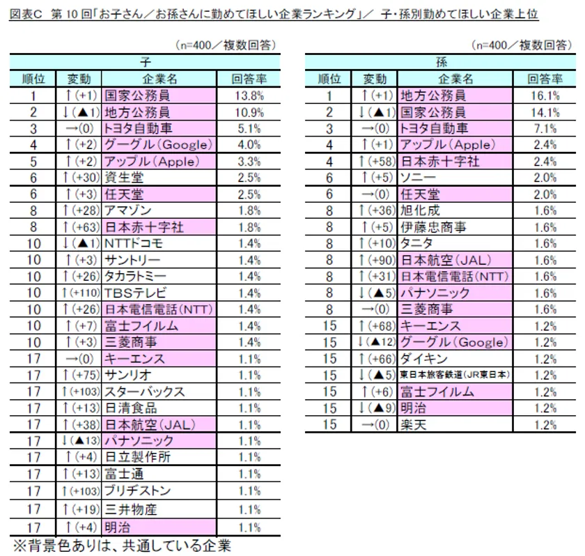 図C_第10回「お子さん/お孫さんに勤めてほしい企業ランキング」/別 勤めてほしい企業上位