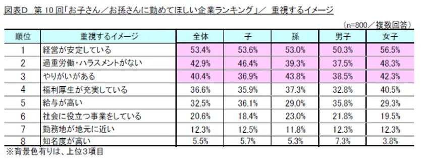 第10回「お子さん/お孫さんに勤めてほしい企業」調査 『経営の安定性』に次ぐポイントは、男子は『やりがい』、 女子は『働きやすさ』