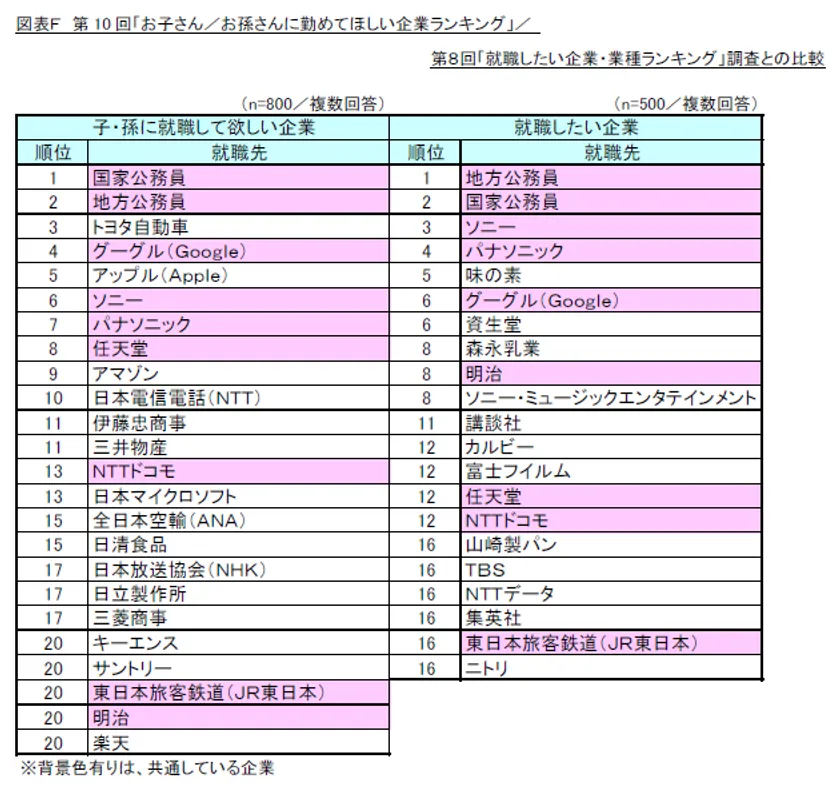 図F_第10回「お子さん/お孫さんに勤めてほしい企業ランキング」/第8回「就職したい企業・業種ランキング」との比較