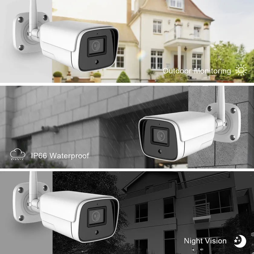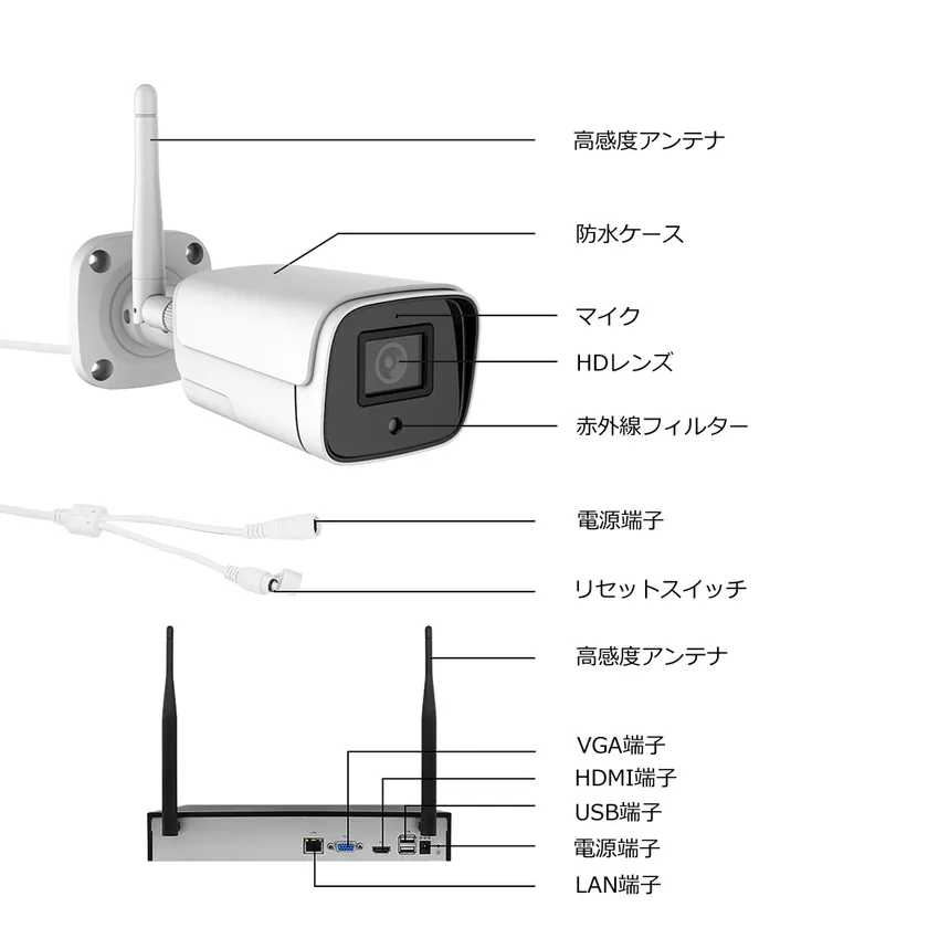 4台のワイヤレスカメラには必要な初期設定が済んでいるので、ご利用にあたり複雑な設定は一切不要です。設営も簡単で、自宅やオフィス、ガレージなどに付属のネジとアンカーで誰でも簡単に取り付けることができます。また、屋外でも利用可能なカメラは防塵・防水のIP66規格に準拠しており、屋外での長期利用も安心です。カメラには赤外線ライトを装備しており、夜間の録画は自動的に暗視モードに切り替わり記録できます。