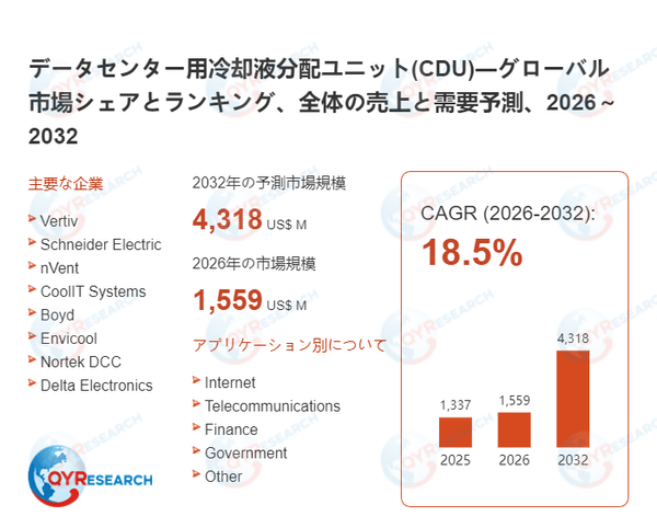 QYResearchが発表した新たな市場調査レポート「データセンター用冷却液分配ユニット(CDU)―グローバル市場シェアとランキング、全体の売上と需要予測、2026~2032」によると、世界のデータセンター用冷却液分配ユニット(CDU)市場規模は2025年の約1337百万米ドルから2026年の1559百万米ドルへと順調に拡大すると見込まれ、予測期間中は年平均成長率(CAGR)18.5%で成長し、2032年には4318百万米ドルに達すると予測されている。