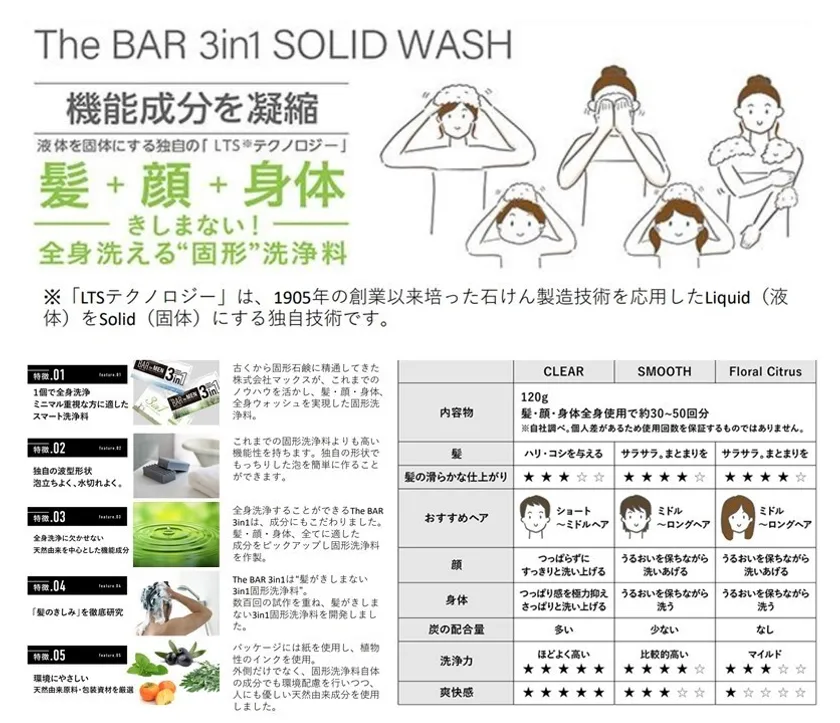 スキンケア・ボディケア・ヘアケア製品の化粧品製造を行う株式会社マックス(本社:大阪府、製造拠点:奈良県、代表取締役社長:大野 範子)は、脱プラスチックに向けた取り組みの一環として、世界ではじめて※固形シャンプーを主体とした洗顔料・ボディソープを一つの洗浄料に集約し、オールインワンの身体洗浄料「The BAR 3in1」の開発に成功したことを発表します。