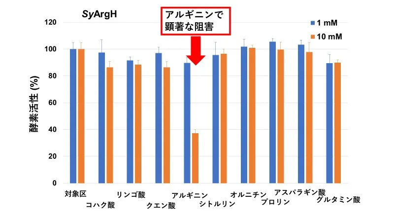 本研究グループは、組換えSyArgHタンパク質を大腸菌で発現させて精製し、その性質を評価しました。その結果、SyArgHは、45℃、pH 8.5の条件で最も高い活性を示しました。また、クエン酸回路やアルギニン生合成系にかかわる物質を添加して、酵素活性を測定しました。その結果、10 mMのアルギニンを添加することによって、37%まで酵素活性が低下することが分かりました(図1)。また、それ以外の物質を10 mMの濃度で添加しても顕著な酵素活性の低下は見られませんでした(図1)。