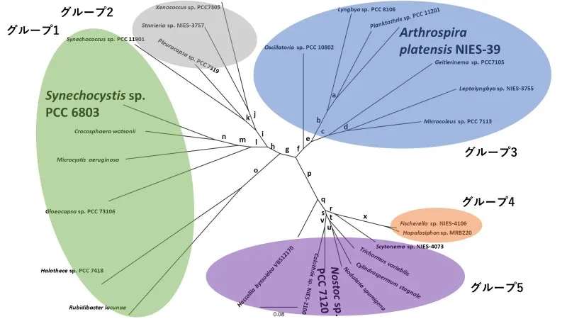 ラン藻のArgHのアミノ酸配列に基づいて作成した分子系統樹。ラン藻のArgHは、アミノ酸配列の違いで5つのグループに分かれた。本研究では、それぞれ異なるグループのラン藻のArgHを解析した。