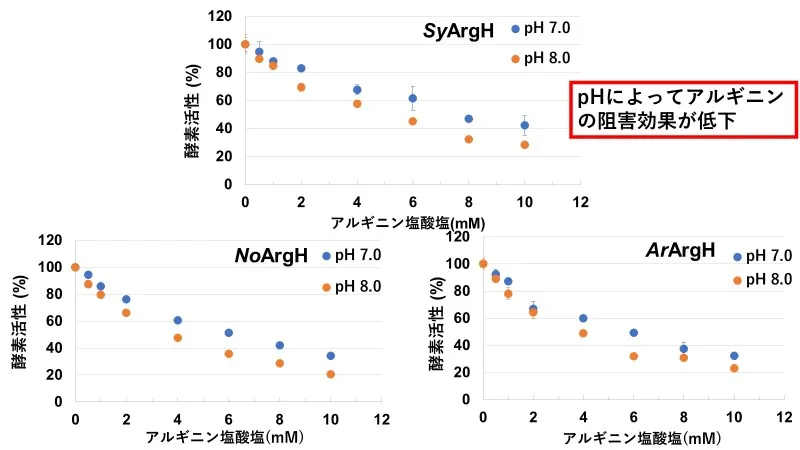以上の結果を踏まえて、アルギニンの濃度とpHを変化させて、ラン藻のArgHの酵素活性を測定しました。その結果、ラン藻のArgHに対するアルギニンの阻害はpH 8.0の時よりもpH 7.0の時の方が弱くなることが分かりました(図4)。このことは、光合成をしている時としていない時で細胞内のpHが変化するラン藻において、アルギニン代謝が変化している可能性を示唆しています。
