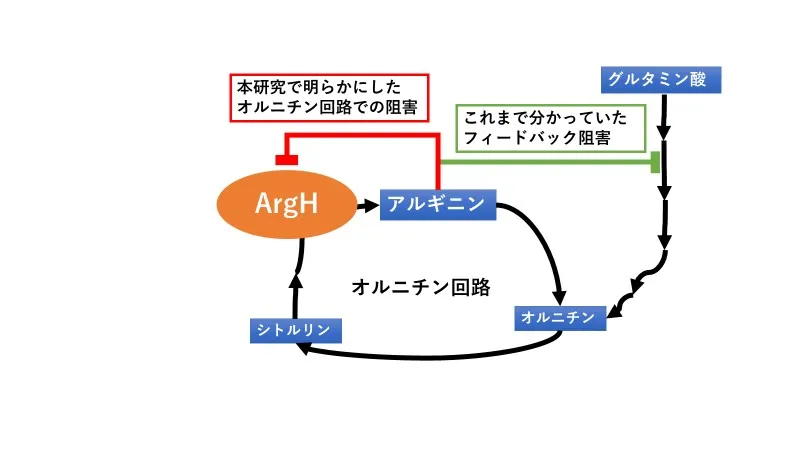 このように、ラン藻のArgHに対するアルギニンの阻害は、ラン藻全体で保存されている可能性があり、さらにpHによって制御されている可能性を示唆しました。このことは、これまで報告されていたフィードバック阻害によるアルギニン生合成の初期反応の制御だけではなく、オルニチン回路内部においても制御されている可能性を示唆しました(図5)。