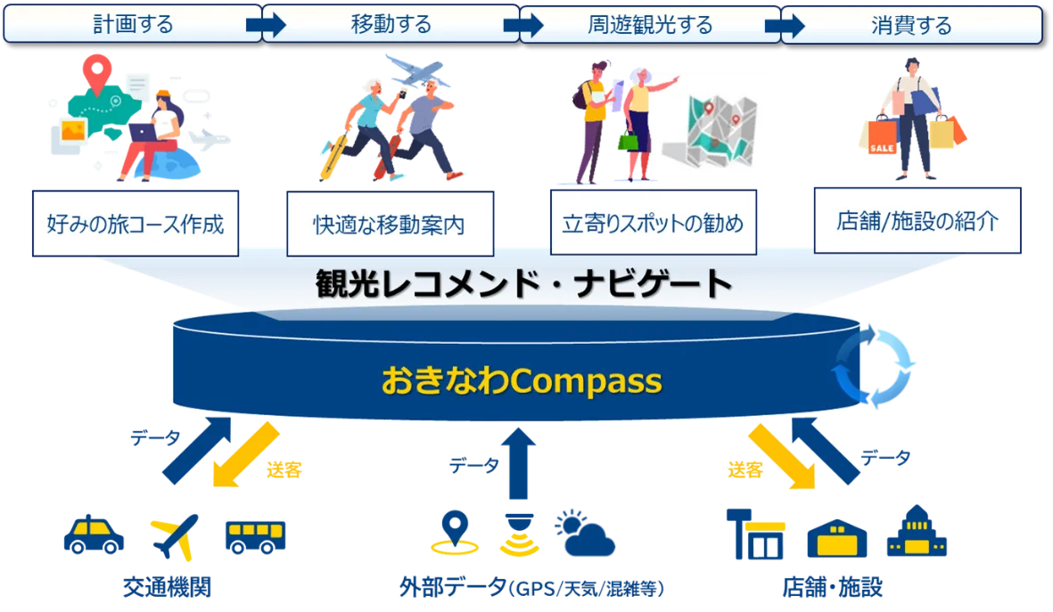 (※1): 「おきなわCompass」実証事業は、経済産業省 令和元年度補正 ものづくり・商業・サービス生産性向上促進補助金 〔令和3年1月15日から3月19日までされた公募ビジネスモデル構築型 2次公募〕として採択を受けています。