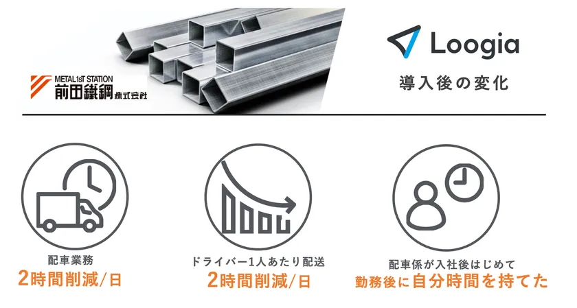 株式会社オプティマインド(本社:愛知県名古屋市、代表取締役社長:松下 健、以下、オプティマインド)は、ラストワンマイルに特化した配送ルート最適化サービス「Loogia(ルージア)」を展開しております。今回、鋼材の加工販売を行う前田鐵鋼株式会社(本社:愛知県春日井市、代表取締役社長:前田 利裕、以下、前田鐵鋼)ではLoogiaを2022年より導入開始し、導入後に配車計画の効率化、大幅な業務時間短縮に成功しました。