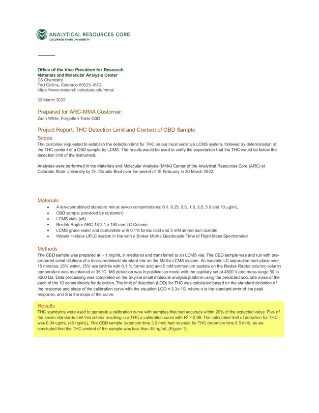 今回、「H2Oアイソレート」の安心安全な品質をさらに皆様に知っていただくために、新たにコロラド州立大学MMA研究所にてTHCの検出限界(LOD)の成分分析検査を実施いたしました。
