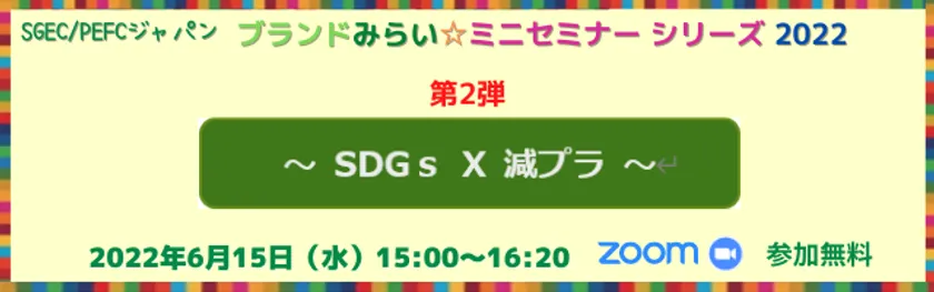 持続可能な森林管理を促進し、そのような森林から切り出された原材料からの木材や紙の使用を普及する、一般社団法人緑の循環認証会議(所在地:東京都千代田区、会長:佐々木 惠彦、略称:SGEC/PEFCジャパン)は、世界的な問題であるプラスチックごみへのお取り組みについて考えていただくことを目的として、「ブランドみらい☆ミニセミナーシリーズ2022」の第2弾「SDGs × 減プラ」を2022年6月15日(水)に開催いたします。