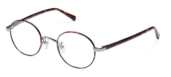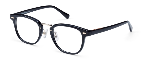 ウエリントンシェイプのコンビネーションフレーム。メタルパーツのブリッジとヨロイの位置を高めに配置したデザインは、シャープで知的な印象に。ヨロイ部分にスクエアの飾りリベットを施し質感を高めています。