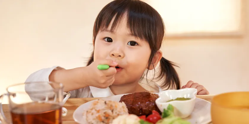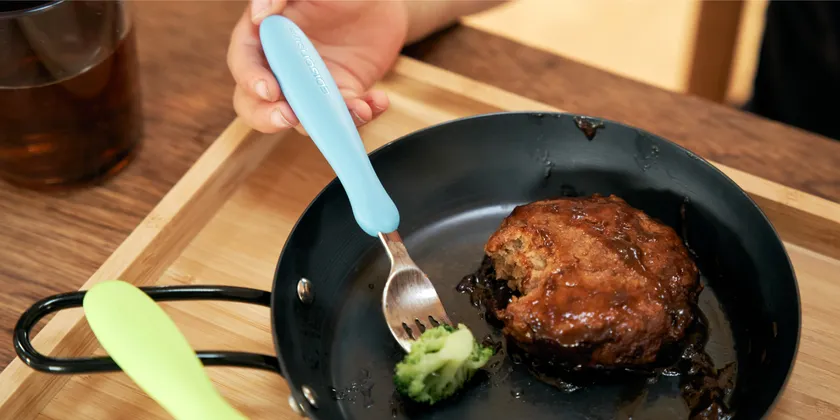 エジソンママ独自の溝が付いているフォークは麺や具材が落ちにくく、食べることが楽しめます。スプーンは平らな形状で最後までしっかりすくうことができます。