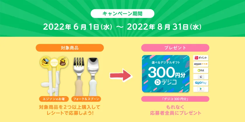 「エジソンのお箸」または「フォーク&スプーン」(ステンレス製※ケース付き含む)を2つ以上購入したレシートをWEB応募フォームで申し込むだけ。