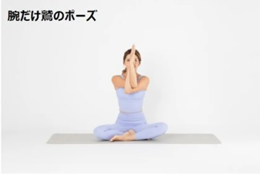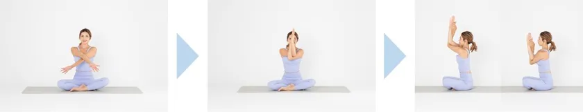 脚は胡坐・安楽座・正座と、骨盤が平行になることを意識しながらご自身の楽な座り方で大丈夫です。腕を上下に重ねて伸ばし、その状態から肘を曲げ、手の甲と甲を合わせます。下の腕の手を反対側の手にクロスさせて、手のひらを合わせます。その状態から吸う息で指先を天井に向けて肘を上げ、吐く息で肘を床の方に下げます。同じ要領で腕の上下を変えて反対側も行います。