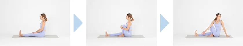 脚を伸ばして、足裏で壁を押すように足首を90度に。片方の足を自分の方へ引き寄せ膝を抱えて背中を伸ばします。抱えた脚と同じ側の腕をぐるっと体の後ろにまわし、手の先は指の腹で捉え床を軽く支える。空いている腕の肘で立てた膝を押すように引っ掛け、肘を伸ばして手を広げます。顎を後ろの肩のラインに合わせ、目線は肩の先後方に。ここでキープしゆっくり5回、鼻で呼吸します。反対側も同じように進めます。戻るときは同じ道を引き返すようにゆっくり戻します。