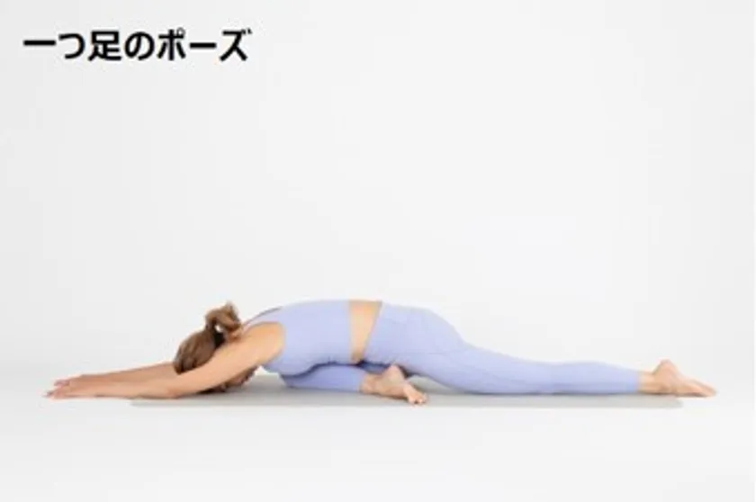 四つ這いになり、片方の脚を胸に引き寄せ手と手の間に置きます。曲げている足のかかとをずらして甲を寝かせ、もう片方は後ろに伸ばします。上半身はリラックスしながら、腕を前方に伸ばしを寝かしていきます。上半身の重みでお尻や脚のストレッチに繋がります。寝た状態でゆっくりと5回、鼻で呼吸。反対側の脚も同じように進めます。戻るときは同じ道を引き返すようにゆっくり戻します。