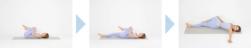 仰向けの状態から両膝を揃えて胸に引き寄せ、両手で膝を抱え顎を引いて1呼吸。その後、片方の脚を両手でかかえたまま、もう一方の脚を伸ばすガス抜きのポーズへ。そして、抱えた脚と反対側の手で膝を掴み、膝を倒しながらねじります。抱えた脚側の腕は床に沿って肩の高さに伸ばし、目線は伸ばした手の先へ。ねじりが終わったところで5回、鼻で呼吸。反対の脚も同じように進めます。