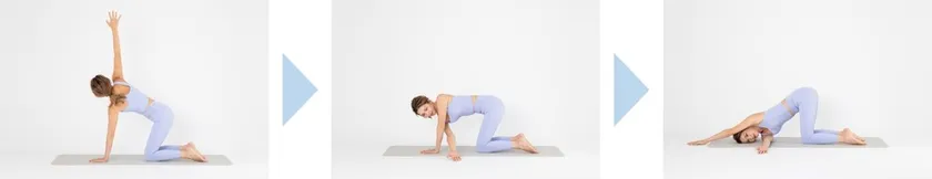 骨盤の下に膝が来るように四つ這いになり、息を吸いながら片手を天井に持ち上げて、吐く息で体側から腕を差し込んでいきます。そのまま肩と耳が床につくように倒していき、反対側の腕は前方に伸ばします。顎を引きよせ天井を見ます。同じように反対の腕も進めます。戻るときは同じ道を引き返すようにゆっくり戻します。
