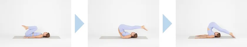 仰向けに膝を立て寝て、膝を胸の方へ引き寄せます。お尻を天井に押し上げ、両手で腰を押さえヒザを伸ばし足先を頭の向こう側に伸ばしていきます。手を床に伸ばし、さらにお尻を遠くへと向け、ゆっくりと足を頭の奥につけます。そこで5呼吸。戻るときは同じ道を引き返すようにゆっくり戻します。