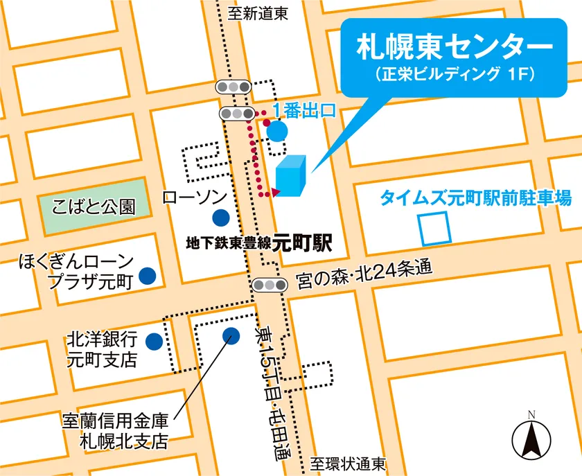 「札幌東センター」は札幌市営地下鉄東豊線「元町」駅から徒歩1分、幹線道路(東15丁目屯田通)に面した1階路面に出店いたします。元町エリアの駅周辺は、大型スーパーや飲食店などの商業施設や医療施設、公共施設も充実し、近隣には住宅街が広がっている東区のほぼ中央にあたります。