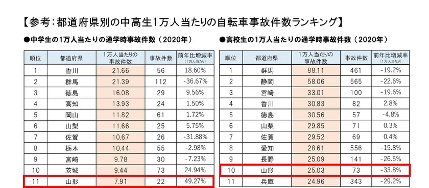 山形県は中学生・高校生の通学時の自転車事故が多く、当委員会の調査では、2020年に発生した1万人あたりの自転車事故件数において、高校生はワースト10となっています。山形県では自転車利用者の悲惨な事故を減らすため、県交通安全条例の改正がなされ、自転車保険の加入義務化のほか、自転車に乗る際のヘルメット着用を努力義務化しています。