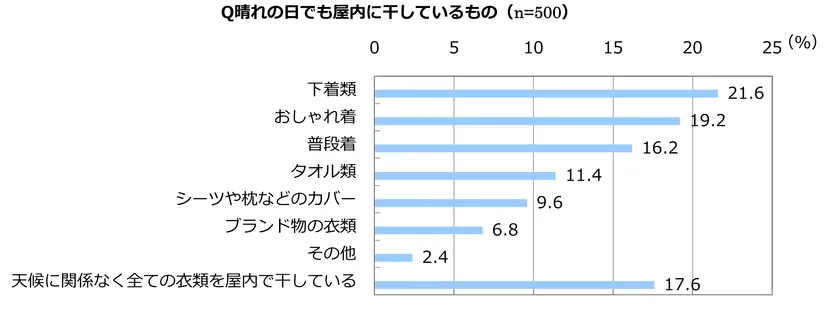 例えば、下着やおしゃれ着など、洗濯物によって干す場所を分けている人が一定数存在することに加え、17.6%の人は天候に関係なく全ての衣類を屋内に干していると回答しました。車の排気ガスやPM2.5などの汚染物質が気になる場合や、花粉や黄砂が飛散する時期にも気軽に室内干しができると便利なのではないでしょうか。
