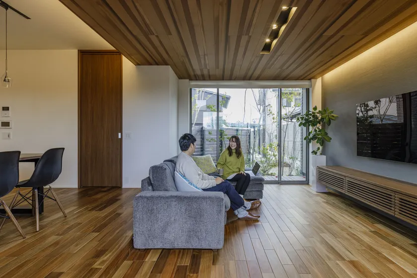 デッキや庭につながる大開口を採用した、開放的なリビング