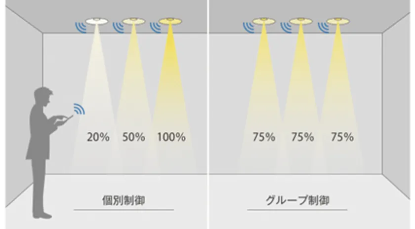 器具は、1台単位で個別に制御が可能です。物件の規模に合わせたシステムを構築し、最大で2,000台の器具を要する大規模施設にも対応します。操作・設定は全てタブレットで行います。持ち運びが容易なので、空間の光色を確かめながら現場で直感的に操作できます。状況や用途に応じた照明グループの設定や器具設置後のレイアウト変更にも配線工事無しで対応可能です。