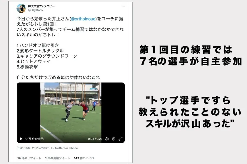 曲がりなりにもラグビー界のトップカテゴリーで活動してきた私が知らないなら、多くの選手にも当てはまるはず。「この情報を自分達だけで持っておくのは勿体ない。みんなにシェアしよう」。SNSを使ってトレーニングの解説動画を発信すると、驚くほどの反応が集まりました。そこで井上さん、大学同期の小倉 智博と技術や戦術の一つ一つを言語化し、動画で配信するプロジェクトとして生まれたのが「らぐびーくえすと」です。私たちにはできない専門スキルの発信には、知り合いのトップ選手たちも喜んで協力してくれています。