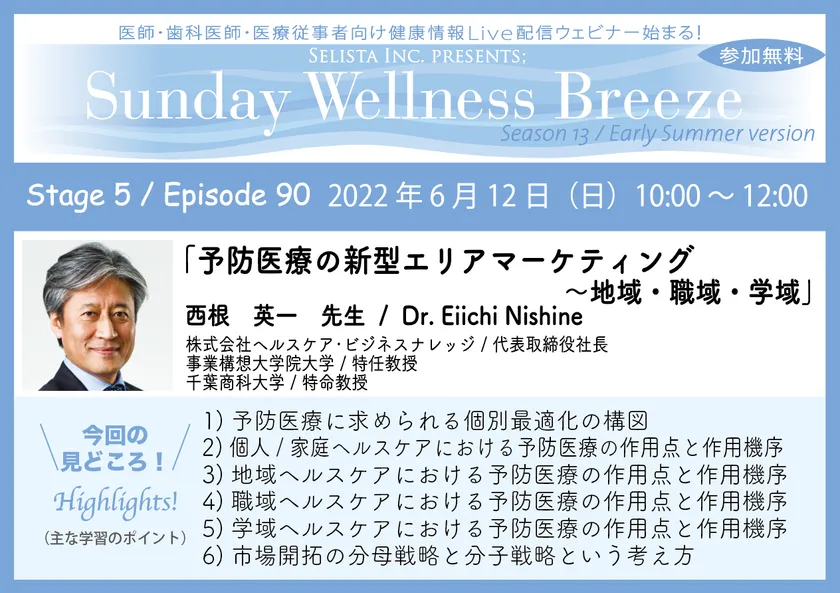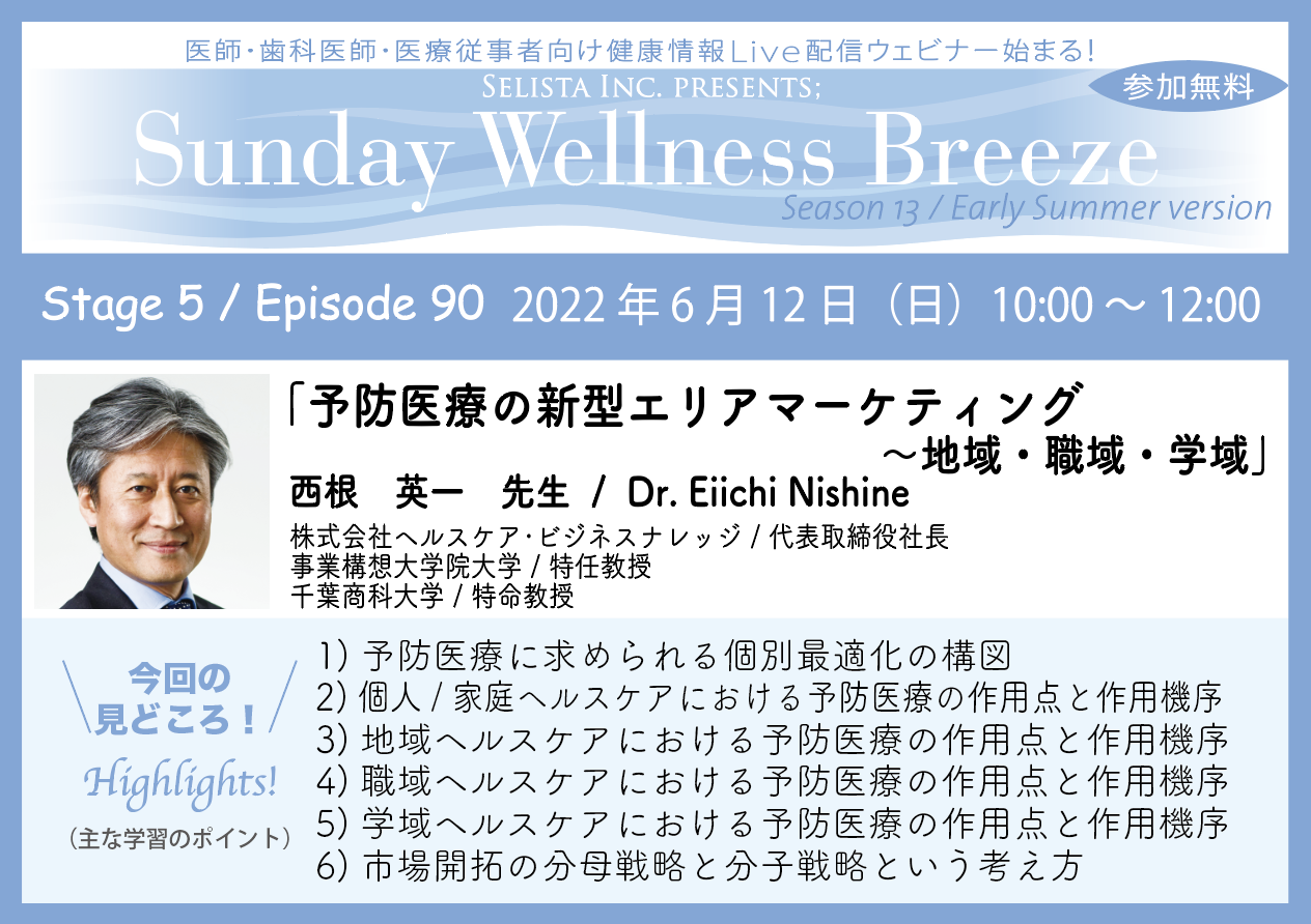 セリスタ株式会社(東京都千代田区、代表取締役:伊藤 承正)は、2022年6月12日(日)に、西根 英一先生(株式会社ヘルスケア・ビジネスナレッジ / 代表取締役社長、事業構想大学院大学 / 特任教授、千葉商科大学 / 特命教授)を講師に迎え、医師・歯科医師・薬剤師・医療従事者限定無料Zoomオンラインセミナー『予防医療の新型エリアマーケティング~地域・職域・学域』を開催します。