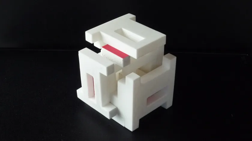 特許取得の仕組みがここにあります。各パーツが完全に組まれた状態では組立てられません。各パーツをずらしながら空間を作り、それにより掛かり止めの仕組みが生まれ、全てのパーツが繋がった時に空間移動が連動しキューブに組み上がります。