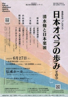 ⼀般社団法⼈東京室内歌劇場(東京都中央区、代表:杉野正隆)主催、一般社団法人東京室内歌劇場コンサート 青島広志プレゼンツ『「日本オペラの歩みその3」清水脩と日本楽派』が2022年6月27日 (月)に渋谷区立文化総合センター大和田 伝承ホール(東京都渋谷区)にて開催されます。チケットはカンフェティ(運営:ロングランプランニング株式会社、東京都新宿区、代表取締役:榑松 大剛)にて発売中です。