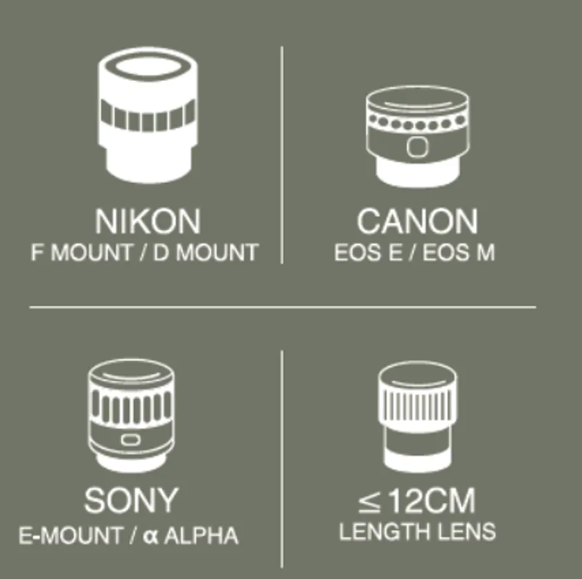 Nikon(Fマウント/Dマウント)、Canon(EOS E/EOS M)、Sony(Eマウント/α アルファ)の長さ≦12cmのレンズに対応可能です。
