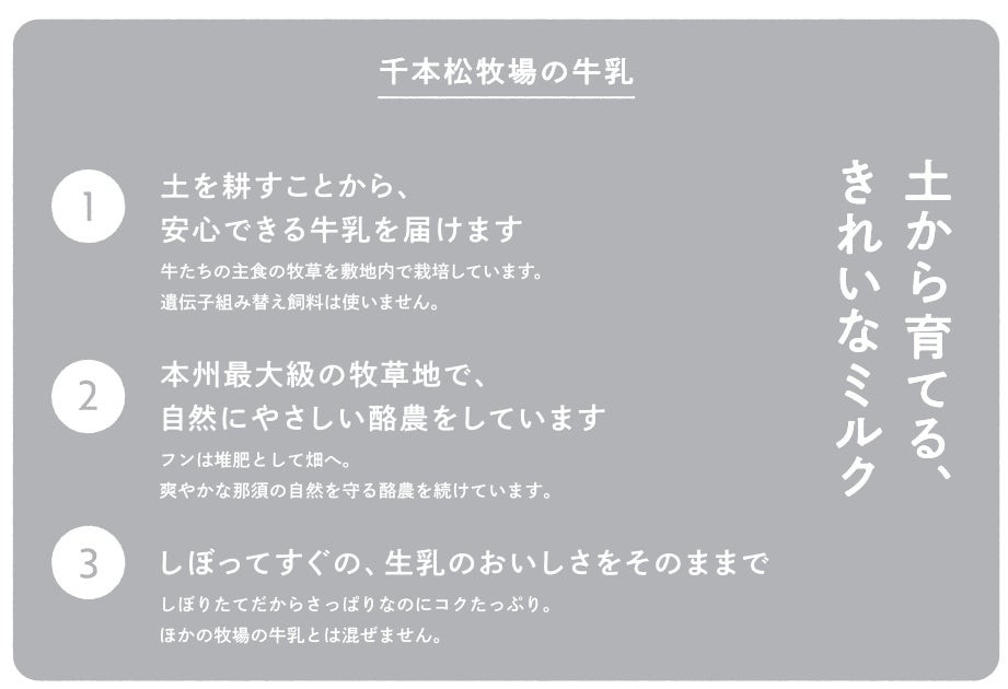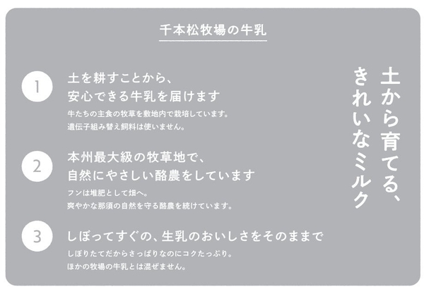 “土から育てる、きれいなミルク”千本松牧場の牛乳: