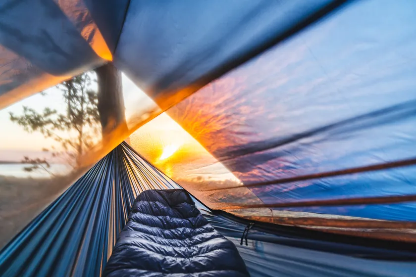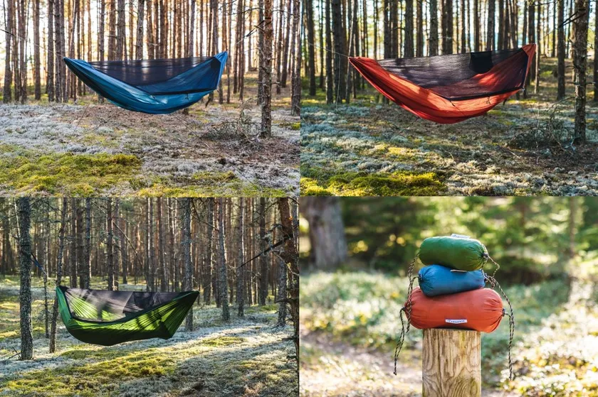本体は蚊帳付き。さらにウーピースリング、ツリーストラップなどのフルサスペンション付きで、総重量わずか760g。コンパクトなワンバッグに収まるバツグンの携帯性。
