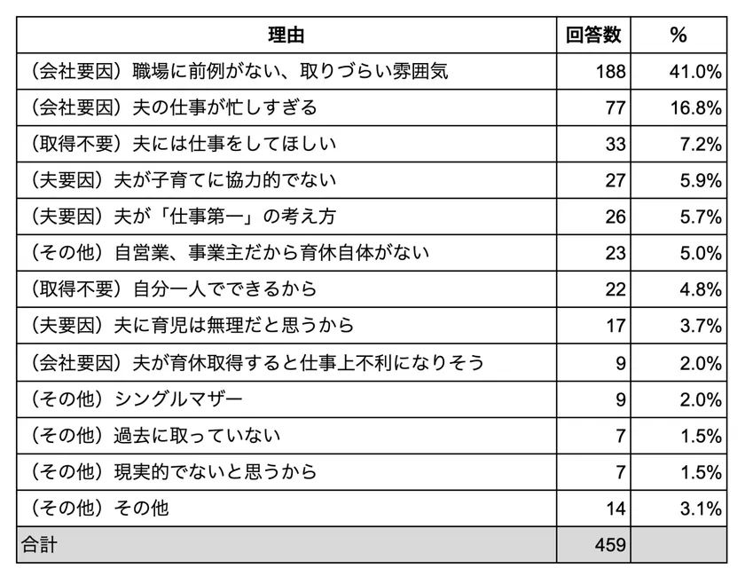 「取得してくれない」理由として、「職場に前例がない、取りづらい雰囲気」などの会社要因が約60%、「夫が子育てに協力的でない」などの夫要因が10%超となった。また、「夫には仕事をしてほしい」などの取得不要という回答も10%超だった他、「自営業、事業主だから育休自体がない」「シングルマザー」という回答も見受けられた。