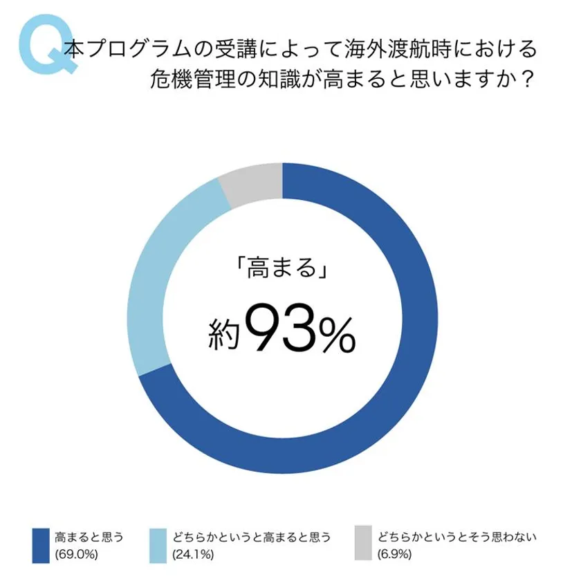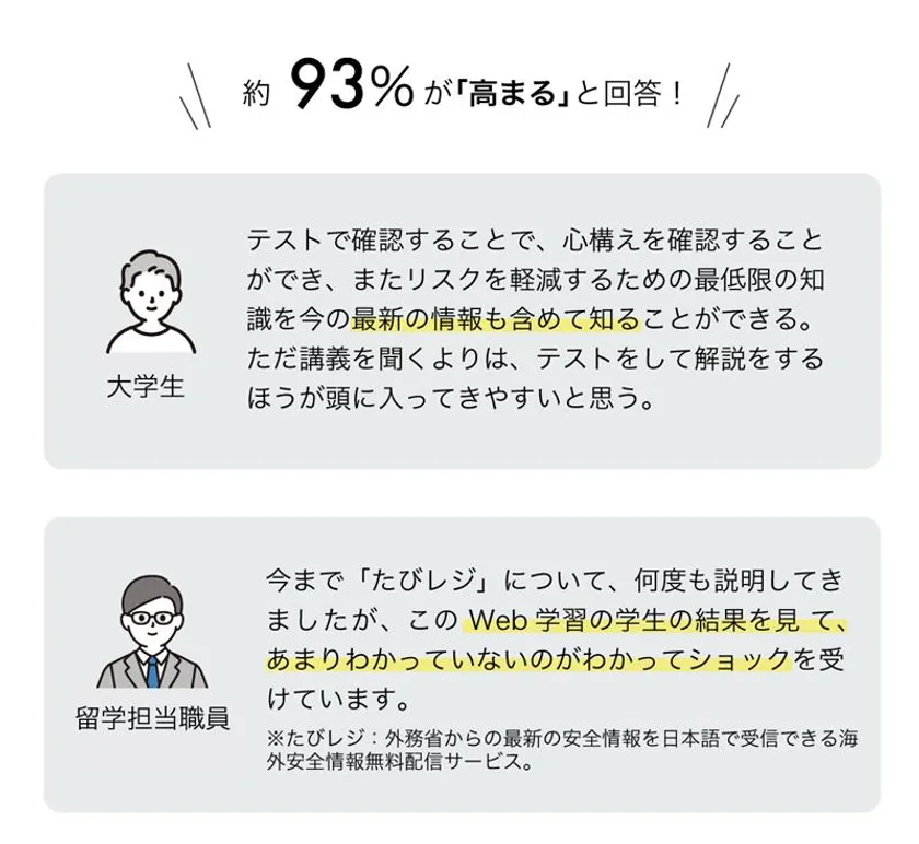 Web学習プログラムの受講結果に基づいたフィードバックと研修を通して、適切なフォローアップをすることで、一人ひとりの理解度を高め、受講者自身の理解状況や、海外や国内での有事対応における心構え、実践的方法を身につけさせる。