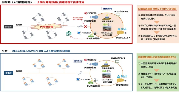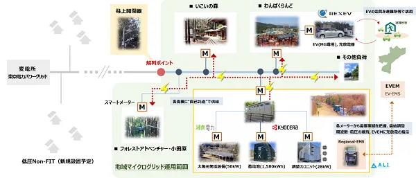 経済産業省「令和2年度および令和3年度 地域の系統線を活用したエネルギー面的利用事業費補助金」を受け、小田原市、京セラ株式会社、株式会社REXEV、湘南電力株式会社、株式会社A.L.I.Technologiesが連携し、小田原こどもの森公園わんぱくらんどエリアにて令和3年度に構築を完了しました。
