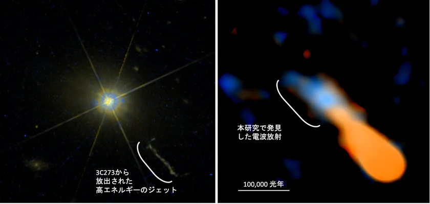 アルマ望遠鏡で観測された3C273の電波画像(右図)。ただし中心の明るい部分は差し引かれています。今回発見された3C273付近の淡く広がった電波放射は、右下に伸びているジェットに比べてもとても弱いです。
