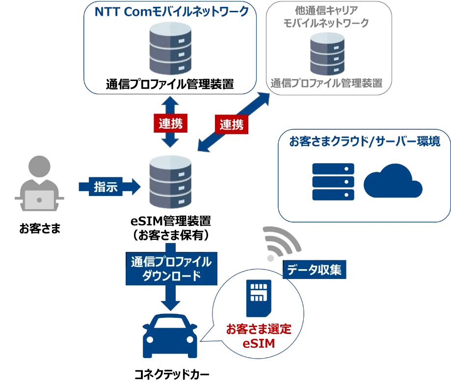 (※5):お客さまのeSIM管理装置との連携には、別途お客さまのeSIM管理装置とNTT Comの通信プロファイル管理装置との接続、およびセットアップ費用が必要となります。詳細は担当営業までご相談ください。