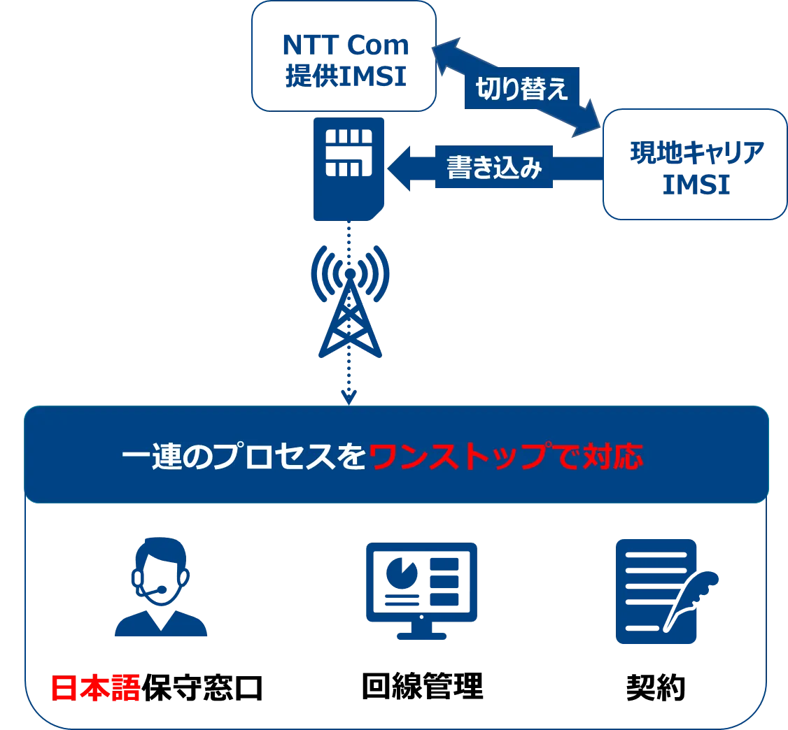 IoT機器を海外で利用する場合、パーマネントローミング規制国(※7)(以下 規制国)では、日本で調達したIoT機器からの常時データ収集や、各種機器の遠隔常時監視などが困難です。この課題に対応するため、NTT Comは国内MVNOとして初めてマルチIMSI方式(※8)を活用した規制国対応をサービス提供します。現地キャリアのIMSIをICM(A)のSIMに書き込み、通常のIMSIと切り替えさせることで、現地キャリアのSIMとして通信することが可能になります。NTT Comが、規制国を含む世界各国において、現地キャリアなどとの契約から回線管理・保守対応まで一連のプロセスをワンストップで対応します。