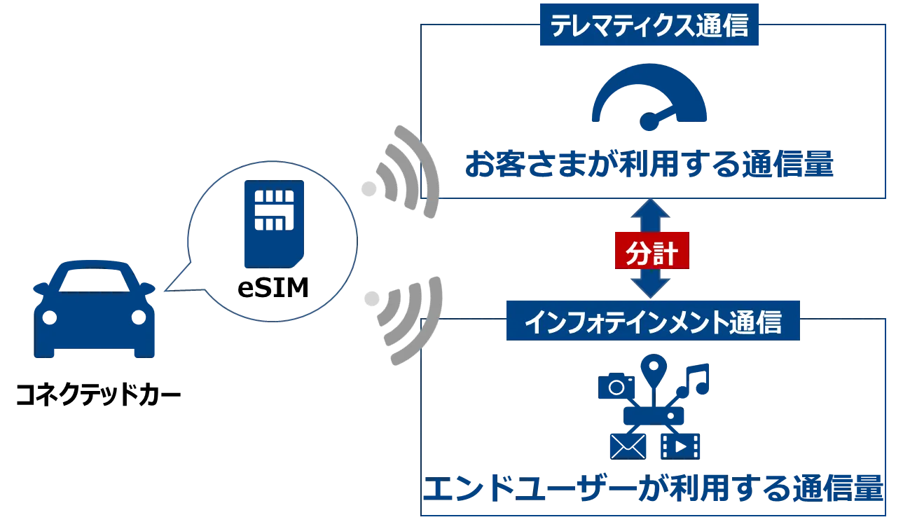 (※9):Split Billingとは、1枚のSIM/eSIMの通信を用途別に複数に分計することで、エンドユーザーへの柔軟なビジネスモデルを可能とする機能です。自動車OEMであるお客様が利用する「テレマティクス通信」と、エンドユーザーが利用する「インフォテインメント通信」を分計する例では、それぞれの通信についてアクセスポイントを分けることで、用途ごとの請求分計を実現可能です。