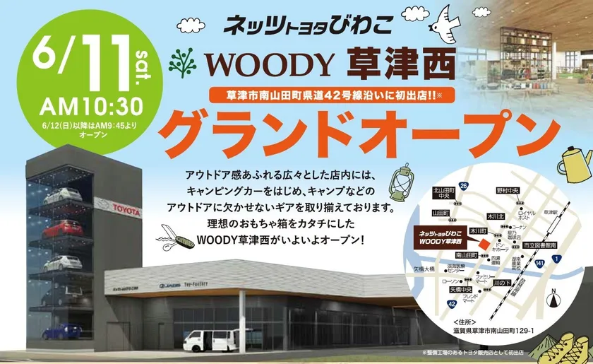 ネッツトヨタびわこ株式会社(本社:滋賀県栗東市、代表取締役社長:中嶋 善夫)は、新店舗「WOODY草津西店」を2022年6月11日(土)にオープンします。