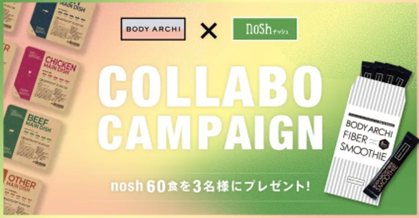 定額制セルフエステ「BODY ARCHI(ボディアーキ)」を展開する株式会社ボディアーキ・ジャパン(所在地:東京都渋谷区、代表取締役社長:近藤 太香巳、以下 ボディアーキ)は、手軽に美味しく栄養管理ができる冷凍宅配食サービス「nosh(ナッシュ)」を手掛けるナッシュ株式会社(所在地:大阪府大阪市、代表取締役社長:田中 智也、以下 当社)と、nosh2ヶ月分(60食分)が3名様に抽選で当たるTwitterキャンペーンを、2022年6月1日(水)~6月14日(火)の期間で開催いたします。