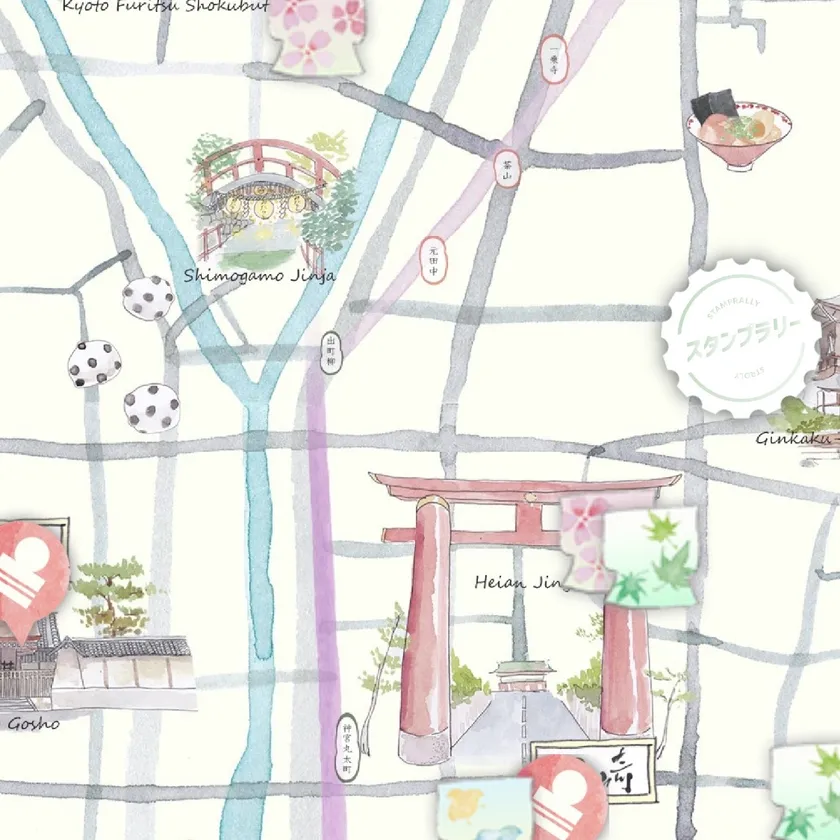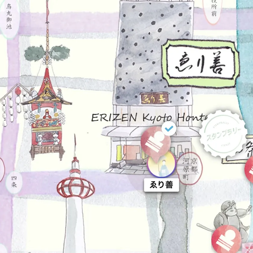HPよりデジタルマップのURLをクリックすると利用が開始されます。スタンプのマークの付近をお散歩すると、場所に応じたポイントを獲得。合計で100点となれば、景品と交換できます。マップには、スタンプのマークの他に、お出かけにオススメの飲食店や店舗の情報が記されています。ゑり善がおすすめするスポットにも足を延ばしていただきながら、京都の街を探索してみてはいかがでしょうか。
