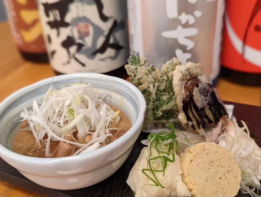 『ランチ限定せんべろセット』は日本酒含むお好きなドリンク2杯と、惣菜5種盛り+京風もつ煮+野菜の天ぷら3種で1,000円(税込み)のお得セットです。